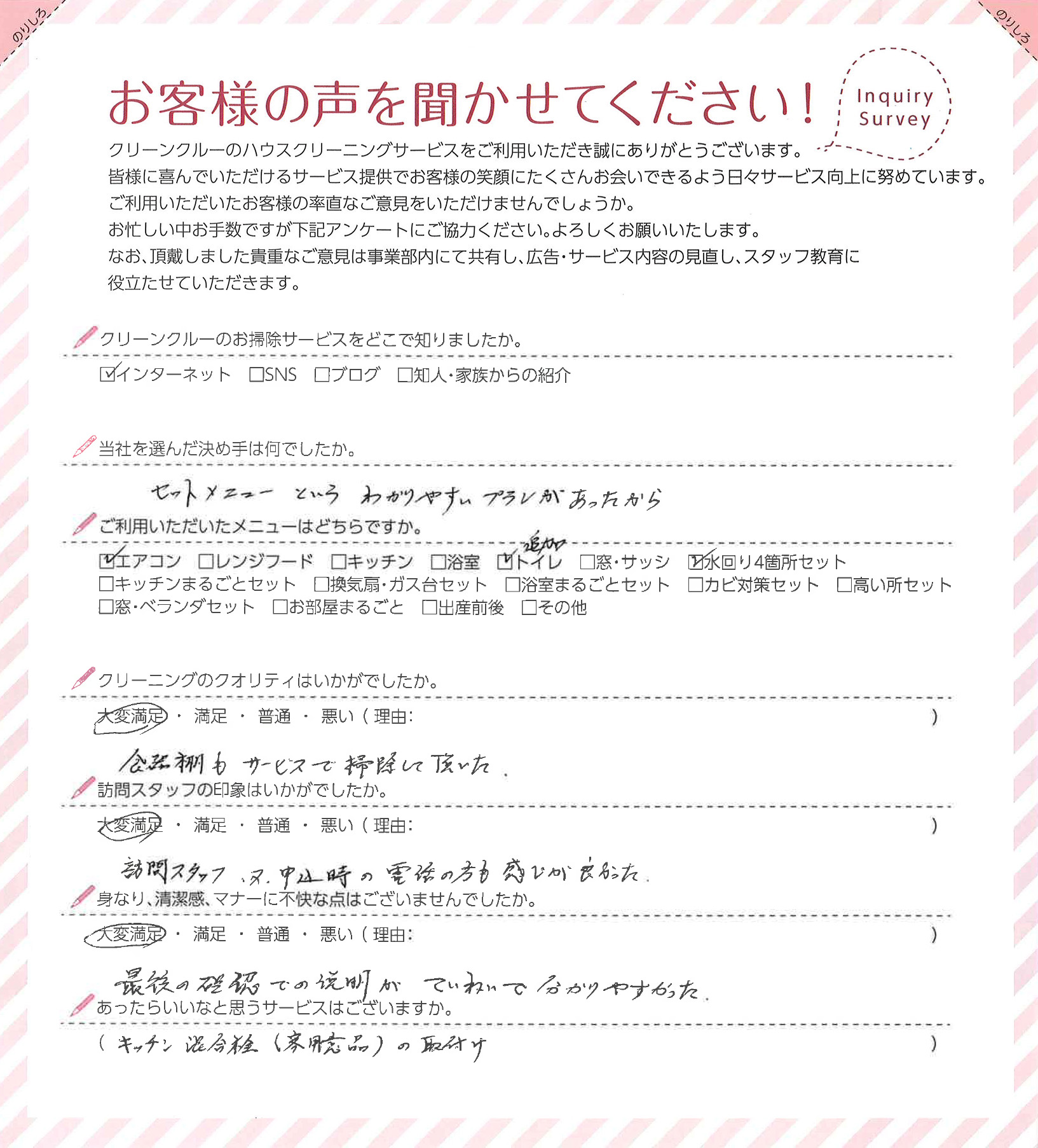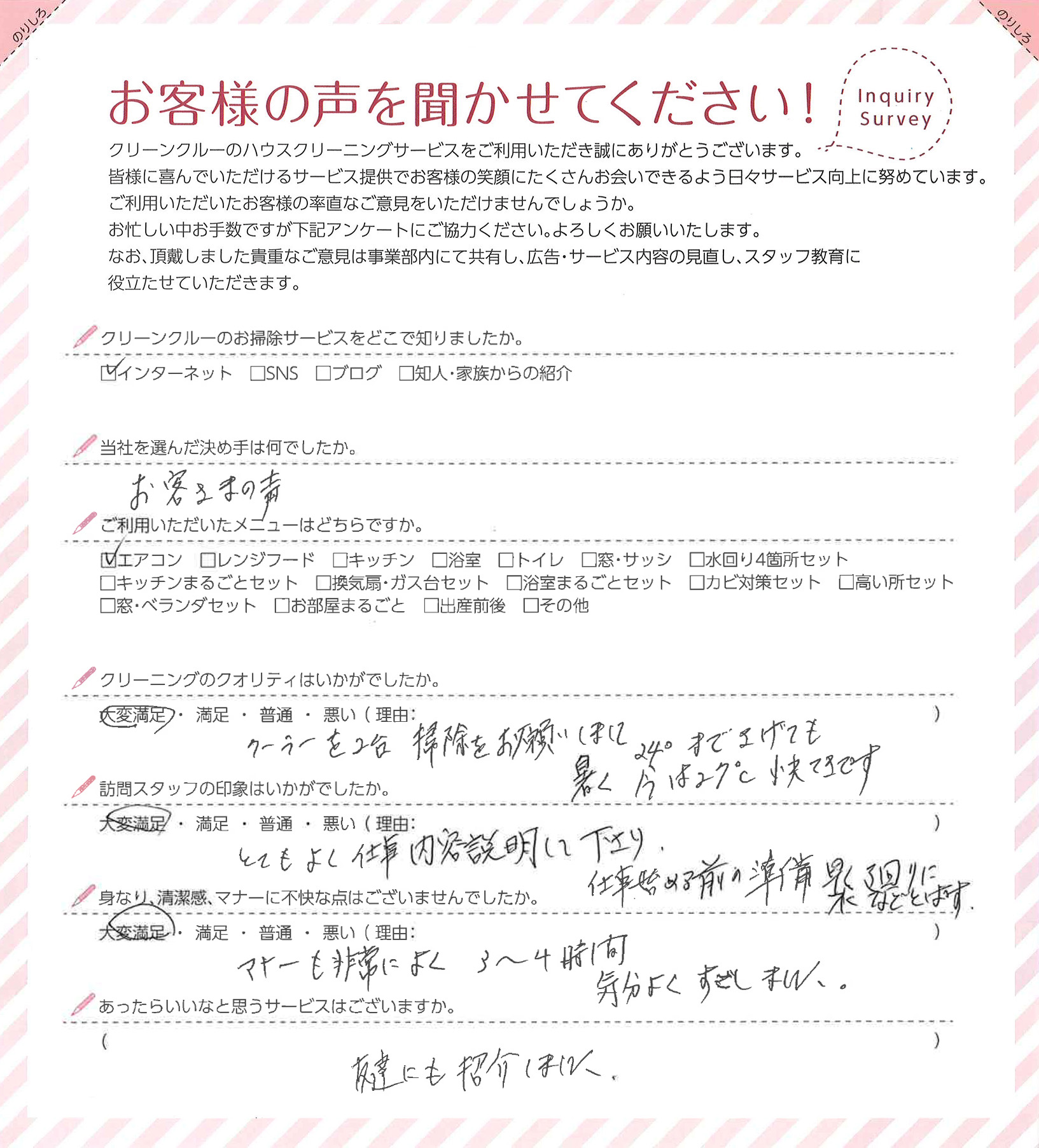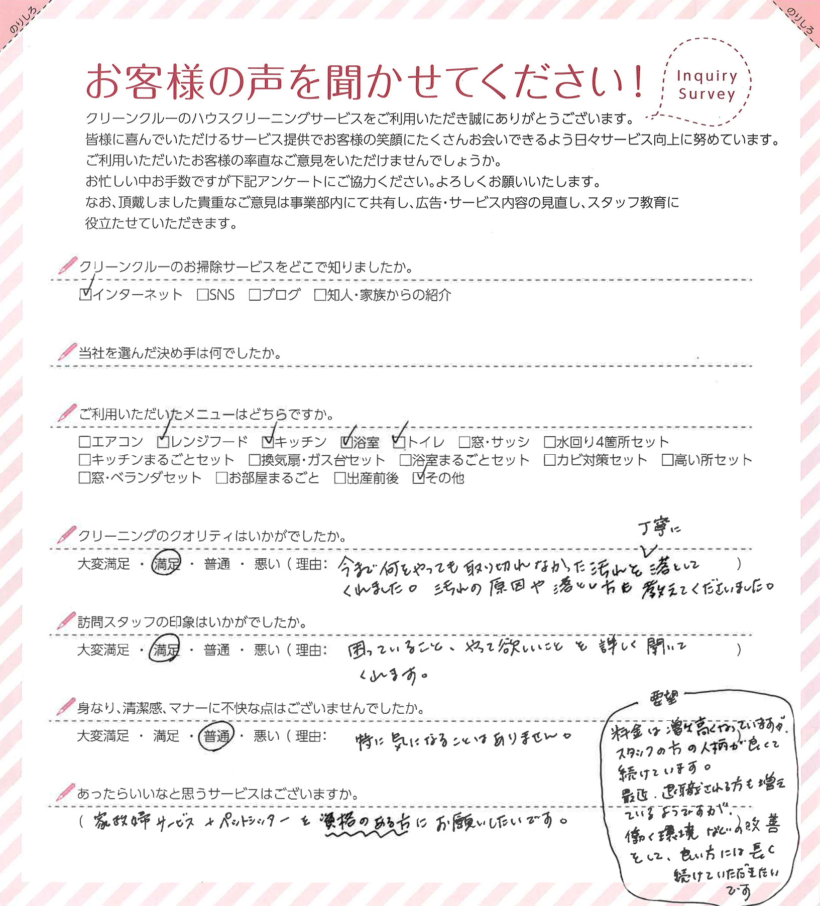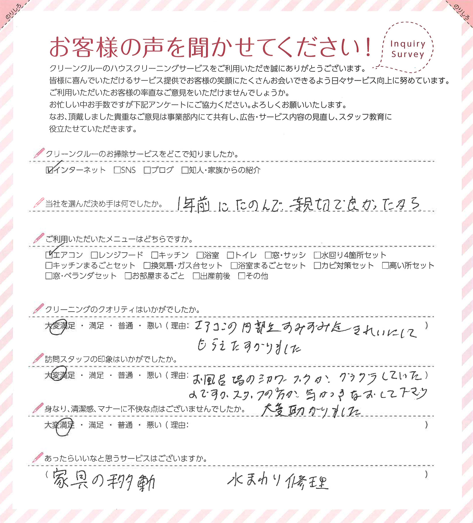エアコンやお風呂もきれいになり満足です。スタッフの方が浴室の不具合に気づいて直してくださり、大変助かりました。親切で丁寧な対応に安心できました。