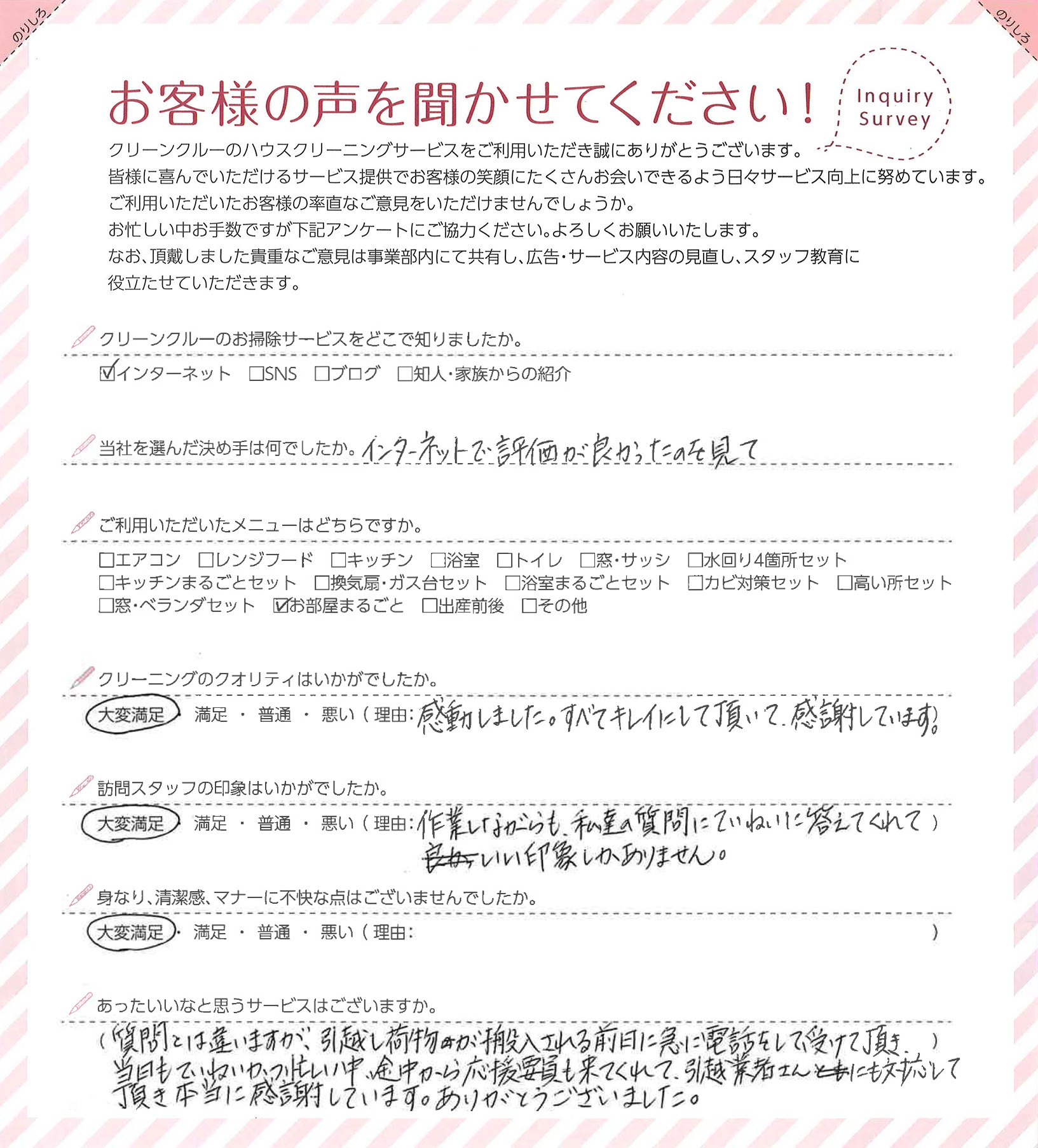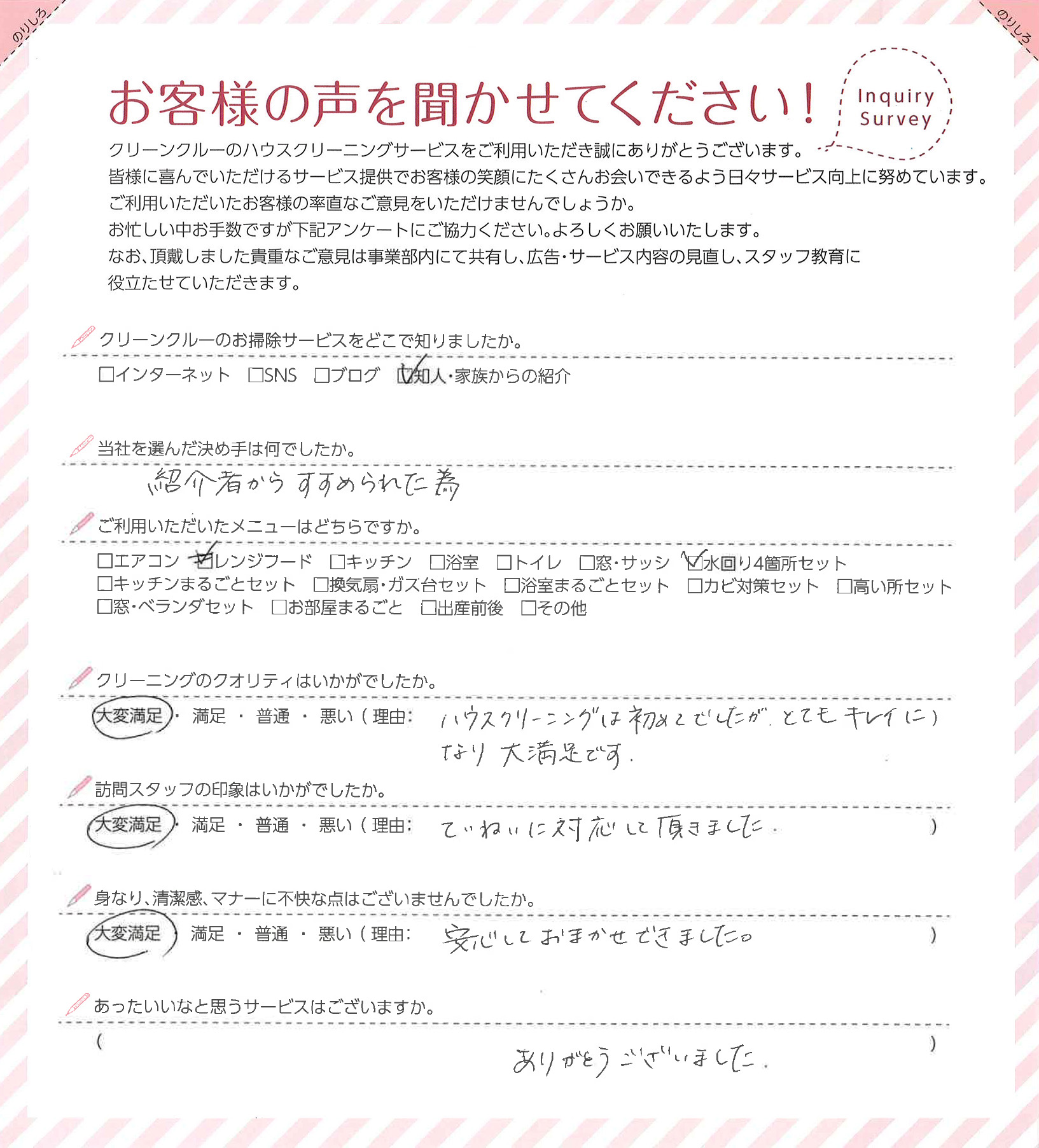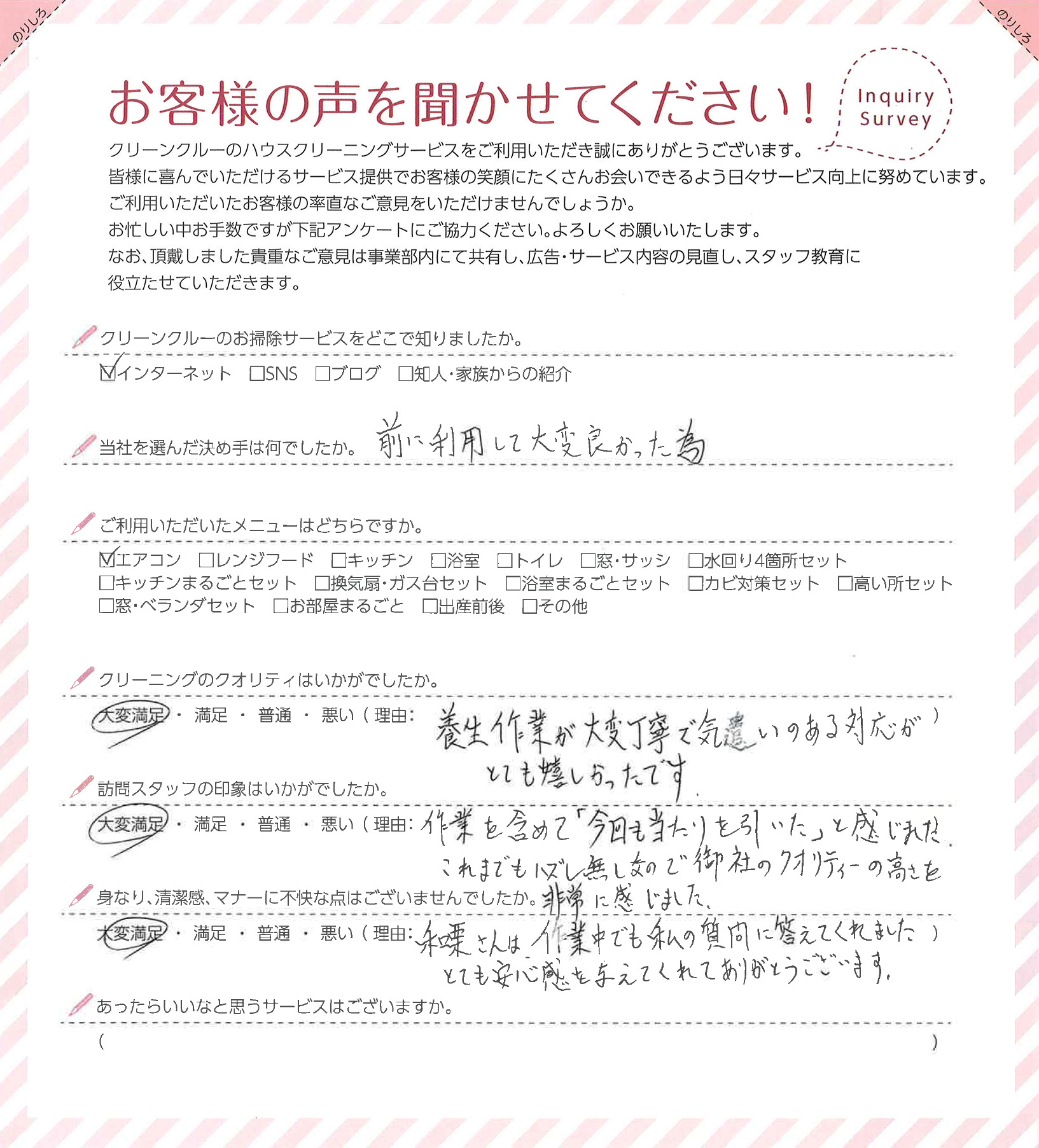 クリーンクルーでは、アドバイザーのサービス向上、機能・技術・ホスピタリティを高める意味もあり、ハウスクリーニングサービスをさせていただいたお客様にアンケートをお願いしています。とても参考になるご意見を常時公開していますので是非ご覧ください。
