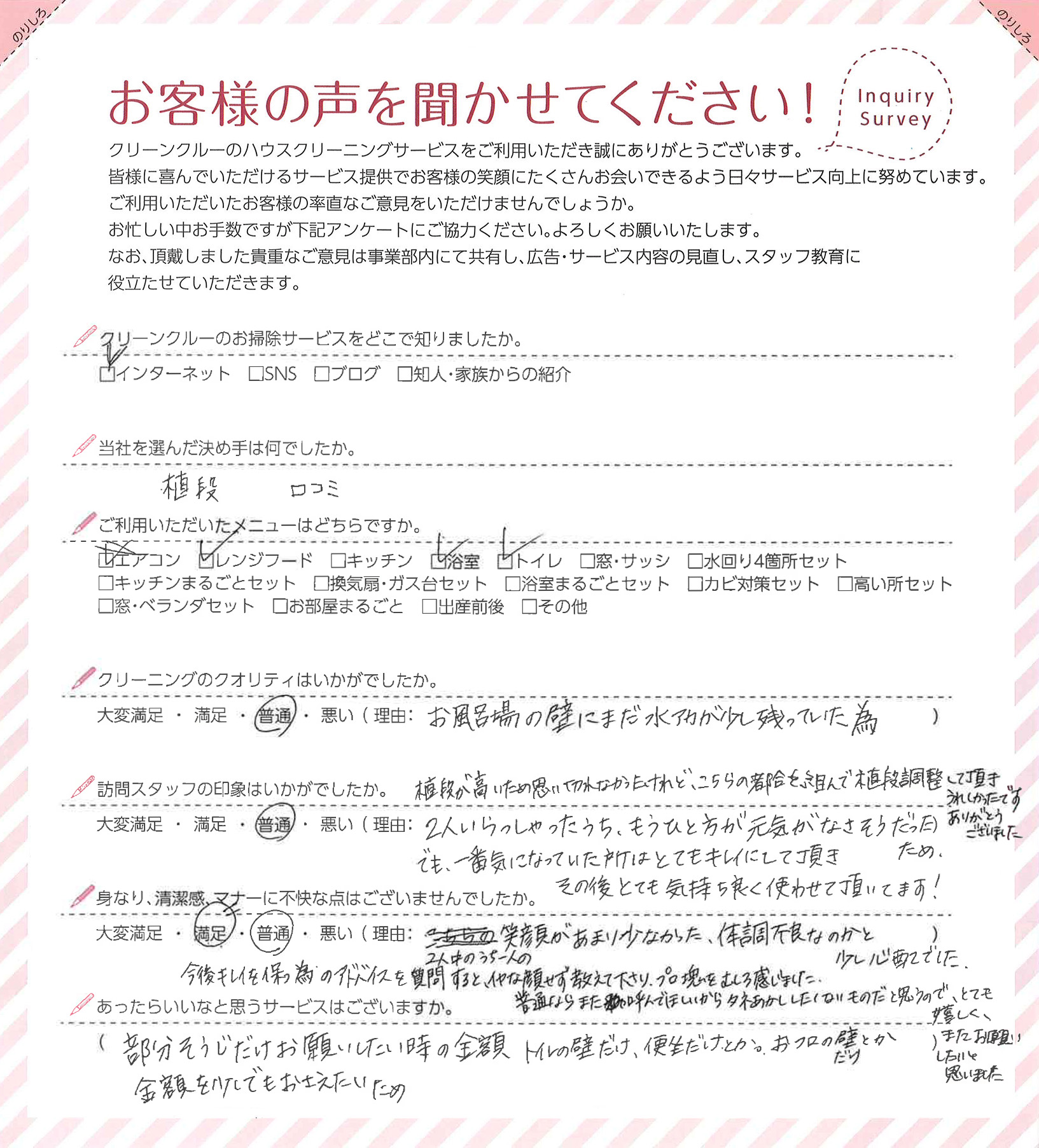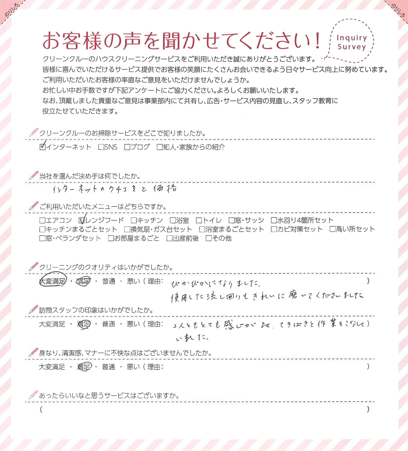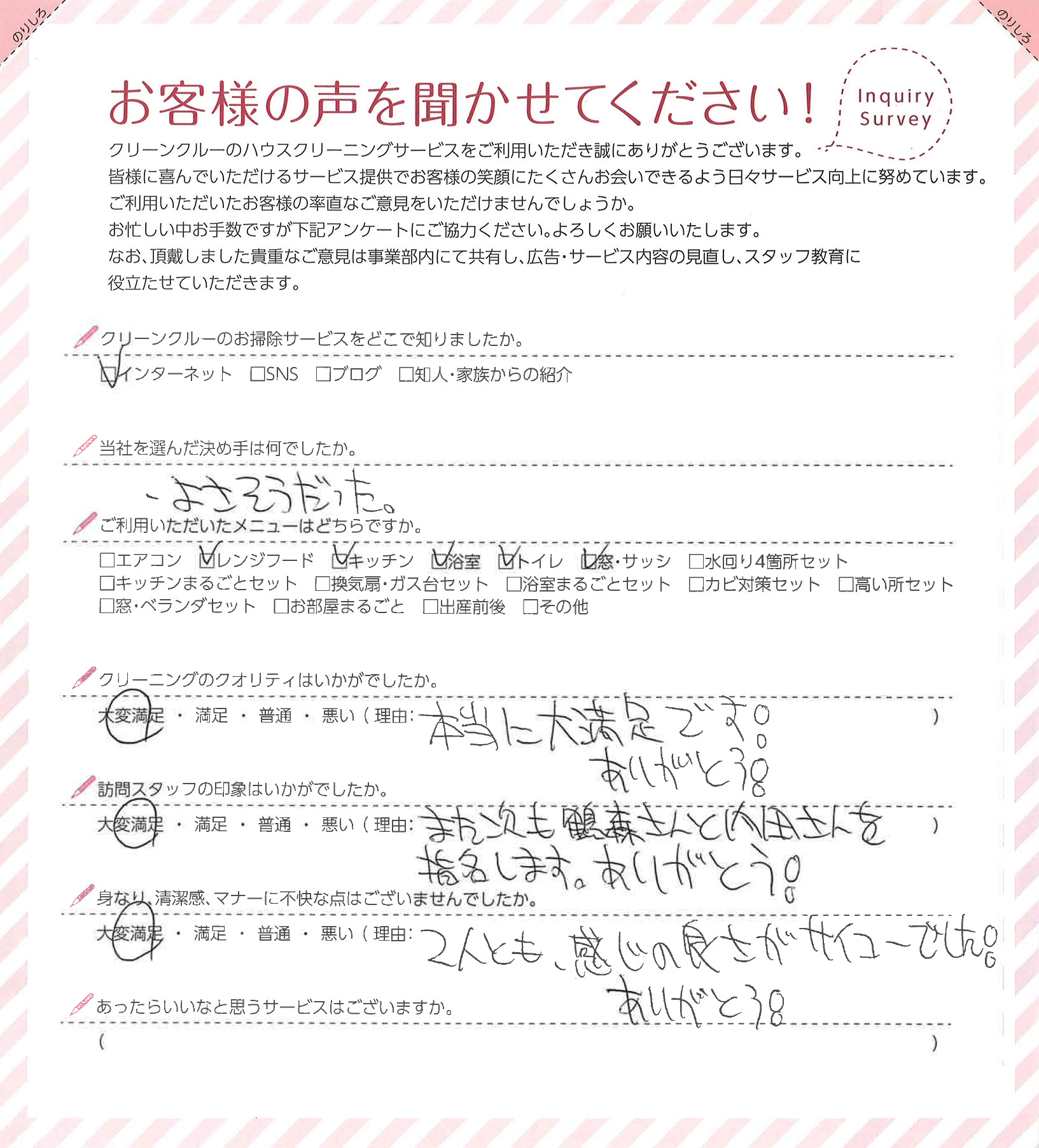 レンジフードや浴室などをお願いしましたが、とても丁寧で大満足でした。スタッフの方の感じも良く、次回も指名してお願いしたいです。