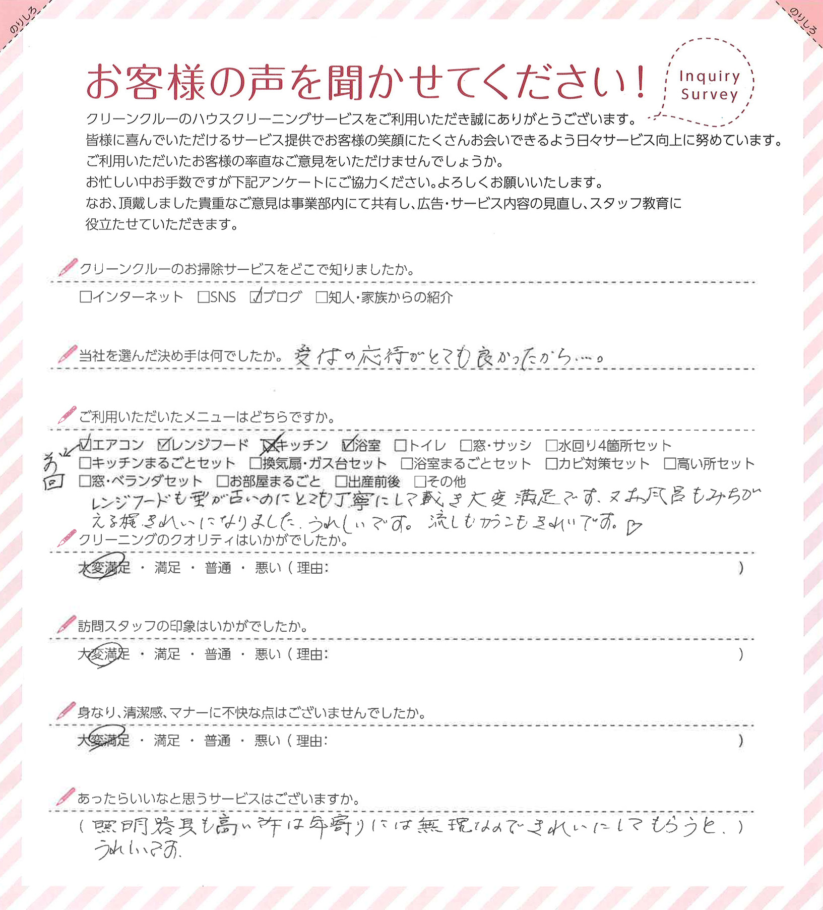 レンジフードや浴室が見違えるほどきれいになり大満足です!