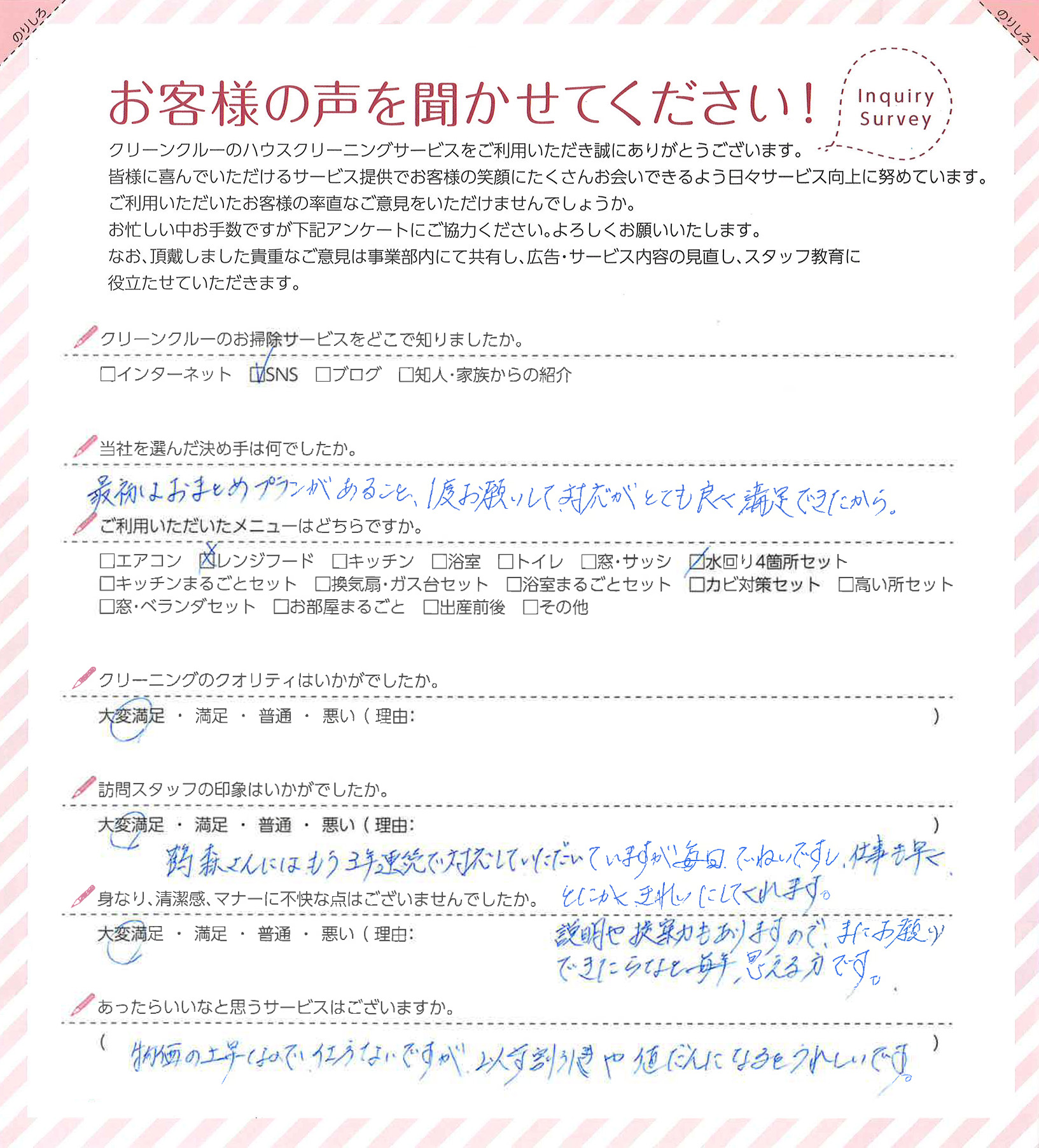 クリーンクルーでは、アドバイザーのサービス向上、機能・技術・ホスピタリティを高める意味もあり、ハウスクリーニングサービスをさせていただいたお客様にアンケートをお願いしています。とても参考になるご意見を常時公開していますので是非ご覧ください。
