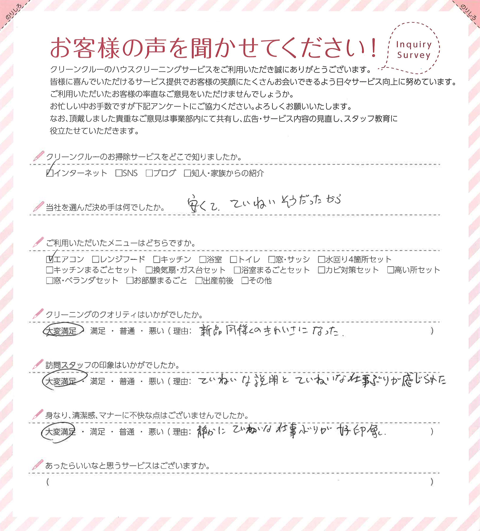 エアコンのお掃除をお願いしましたが、新品のようにきれいになりました。説明も作業も丁寧で、細部まで配慮が行き届き安心できました。