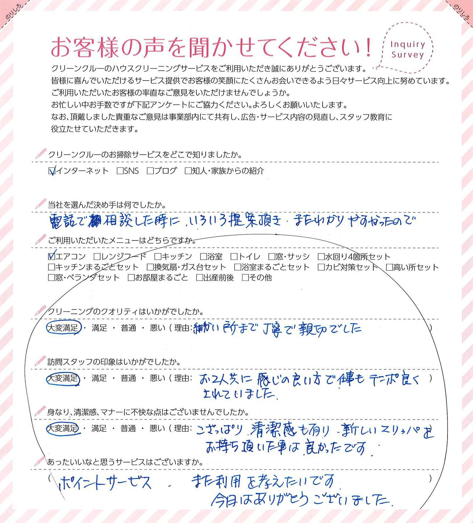 寝室のエアコン一台を掃除していただきました。カビで真っ黒だったエアコンが綺麗になり、安心して毎日使っています。